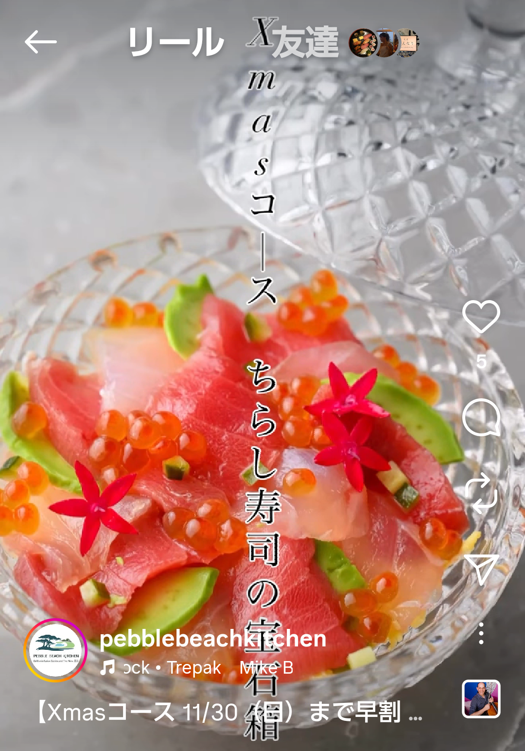 日本を代表する寿司もPEBBLE BEACH KITCHENならではの、薬味に嗜好を凝らした握りをご提供していますが、クリスマスコースでは「特製ちらし寿司の宝石箱」をご用意いたします。
