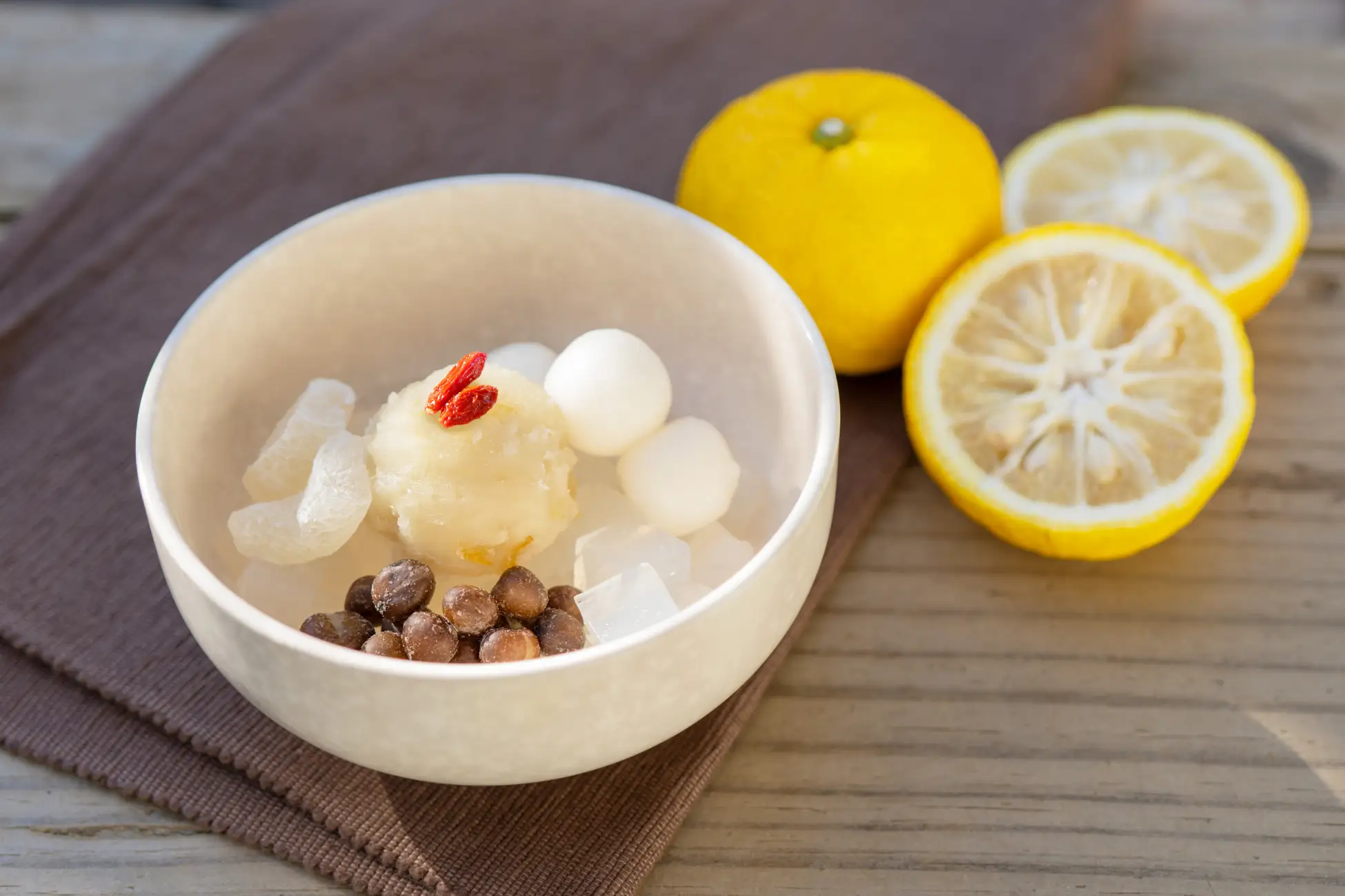 柚子寒天、柚子餡、もちもちの白玉に求肥、塩ゆでした赤えんどう豆と、素材ひとつひとつにこだわった逸品です。柚子の爽やかさを引き立てるよう、付属の蜜はすっきりとした白蜜をご用意しました。