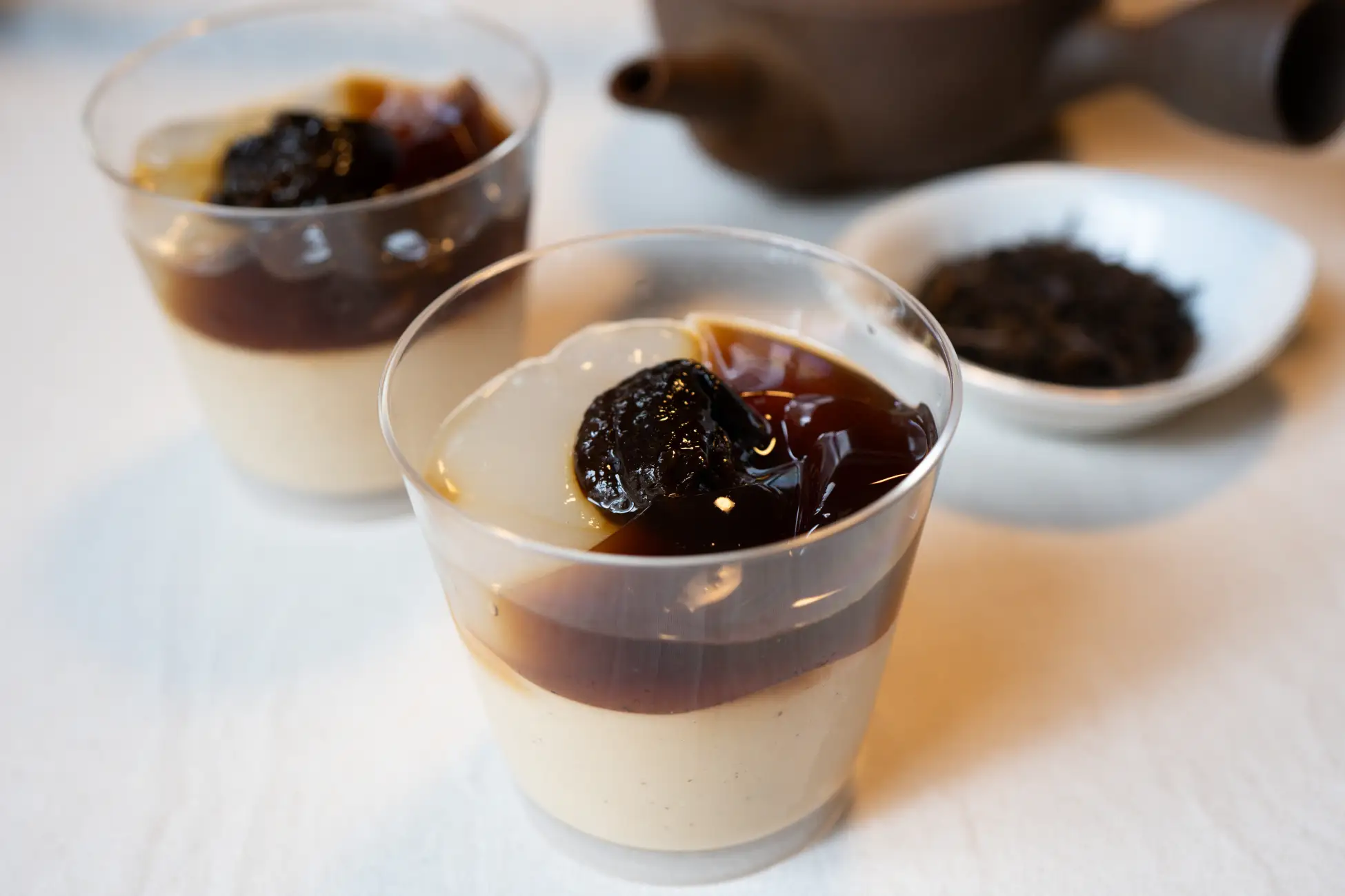 香ばしいほうじ茶の香りがふんわりと広がる、和の要素を取り入れた洋風スイーツ。ほうじ茶を使用したブランマンジェの上には、つるんとしたほうじ茶ゼリーと水まんじゅう、そして甘酸っぱいプルーンをトッピング。
