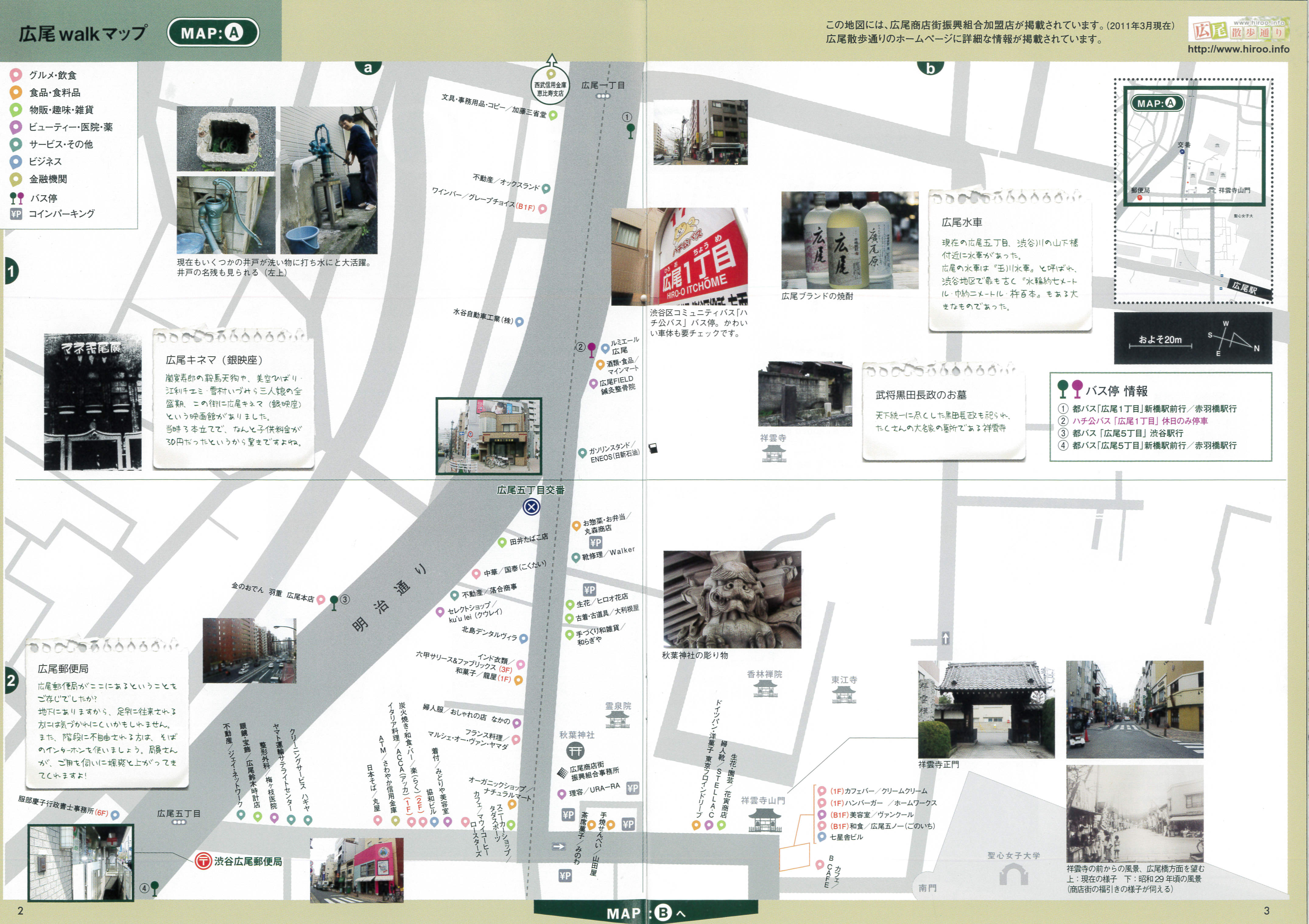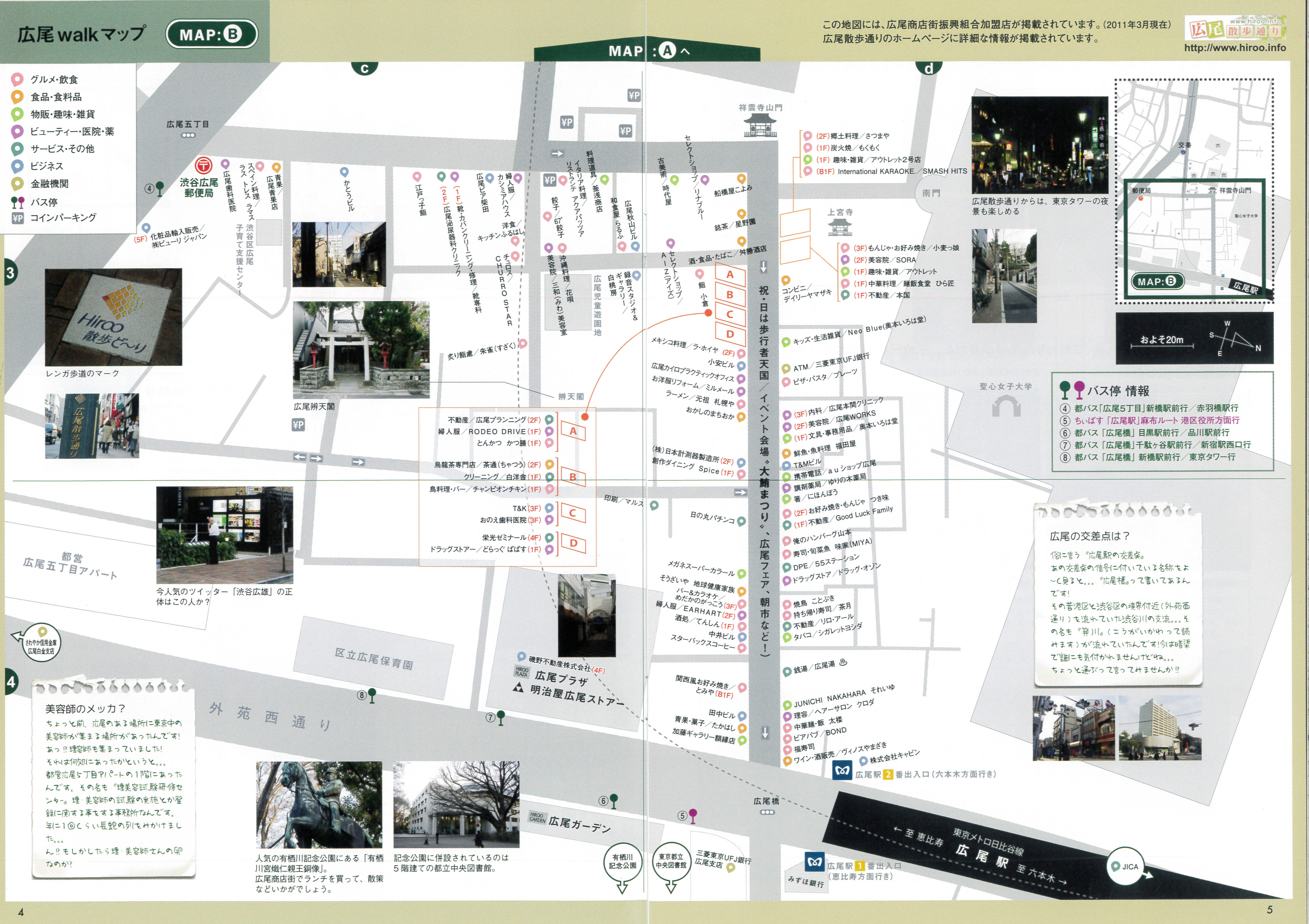 2011年の創刊号では、広尾散歩通りのマップは地区別に二つに分けて、4ページに亘って掲載されていました。小ネタが入り、北を上にして描かれている現在のマップとは違う構図です。
