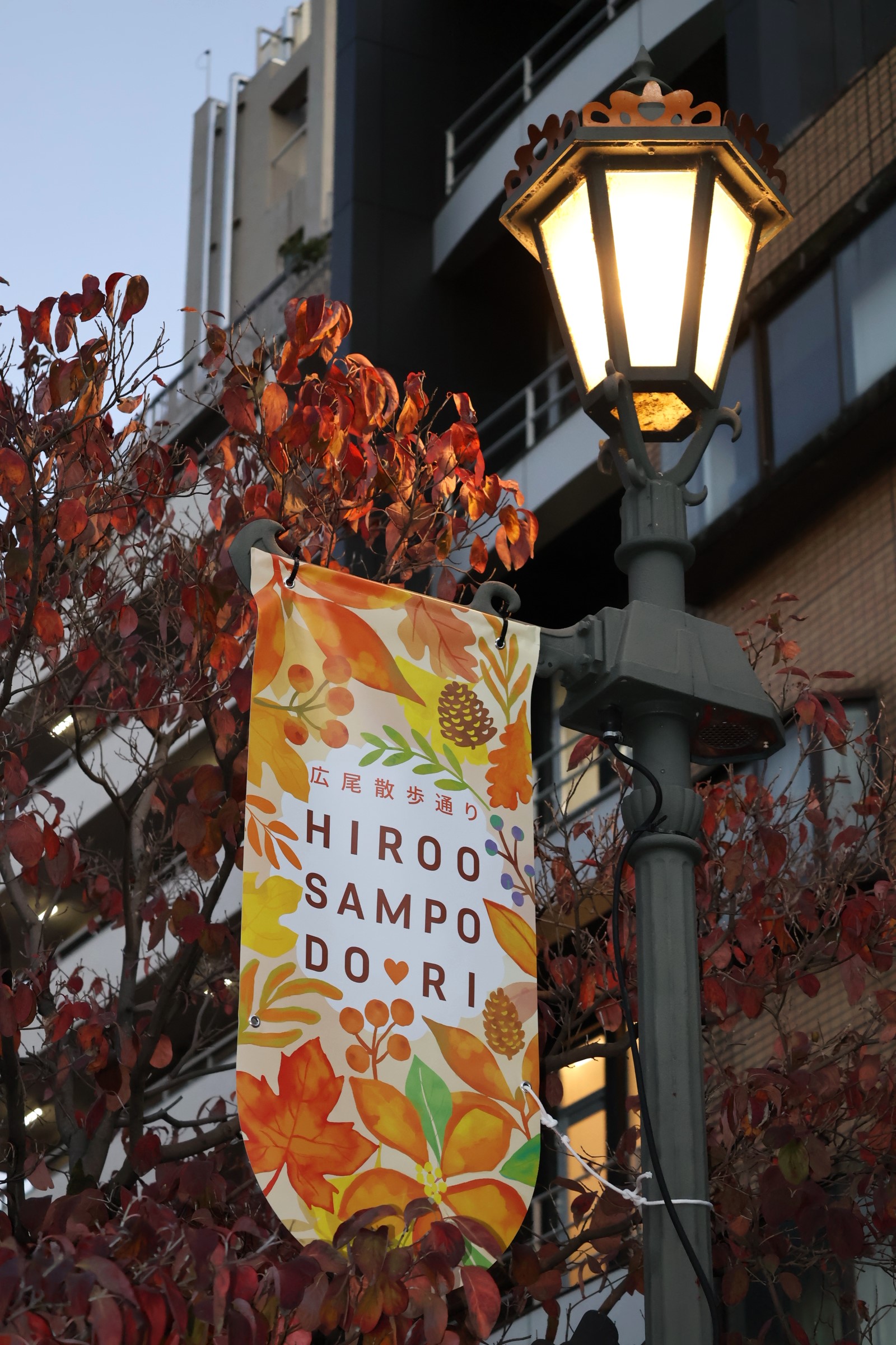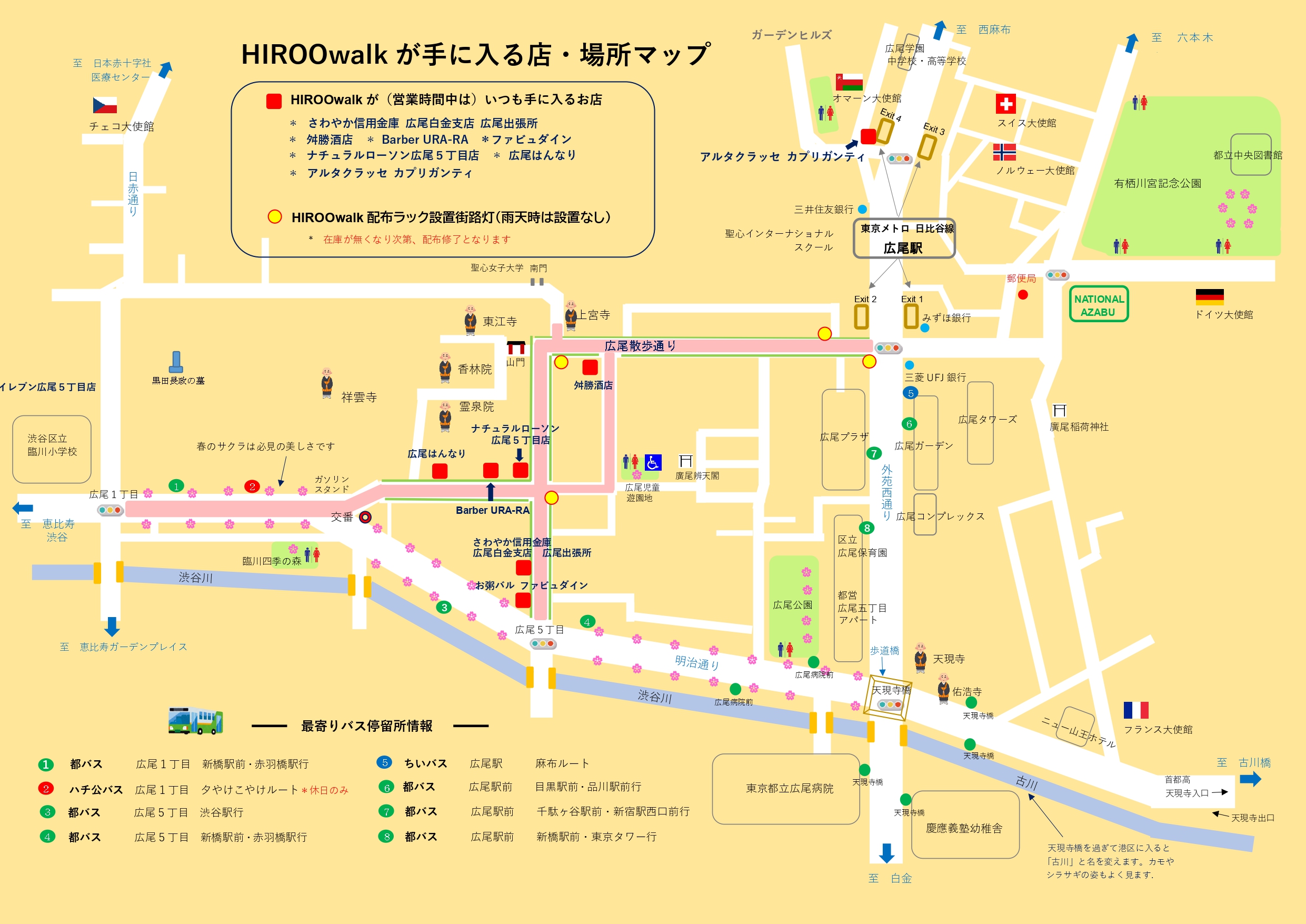 また晴天時にはセブンイレブン広尾駅前店前、銭湯広尾湯前、船橋屋こよみ前、カシミヤカシミヤ前の街路灯にHIROOwalk専用ラックを設置しますのでご自由にお持ちください。