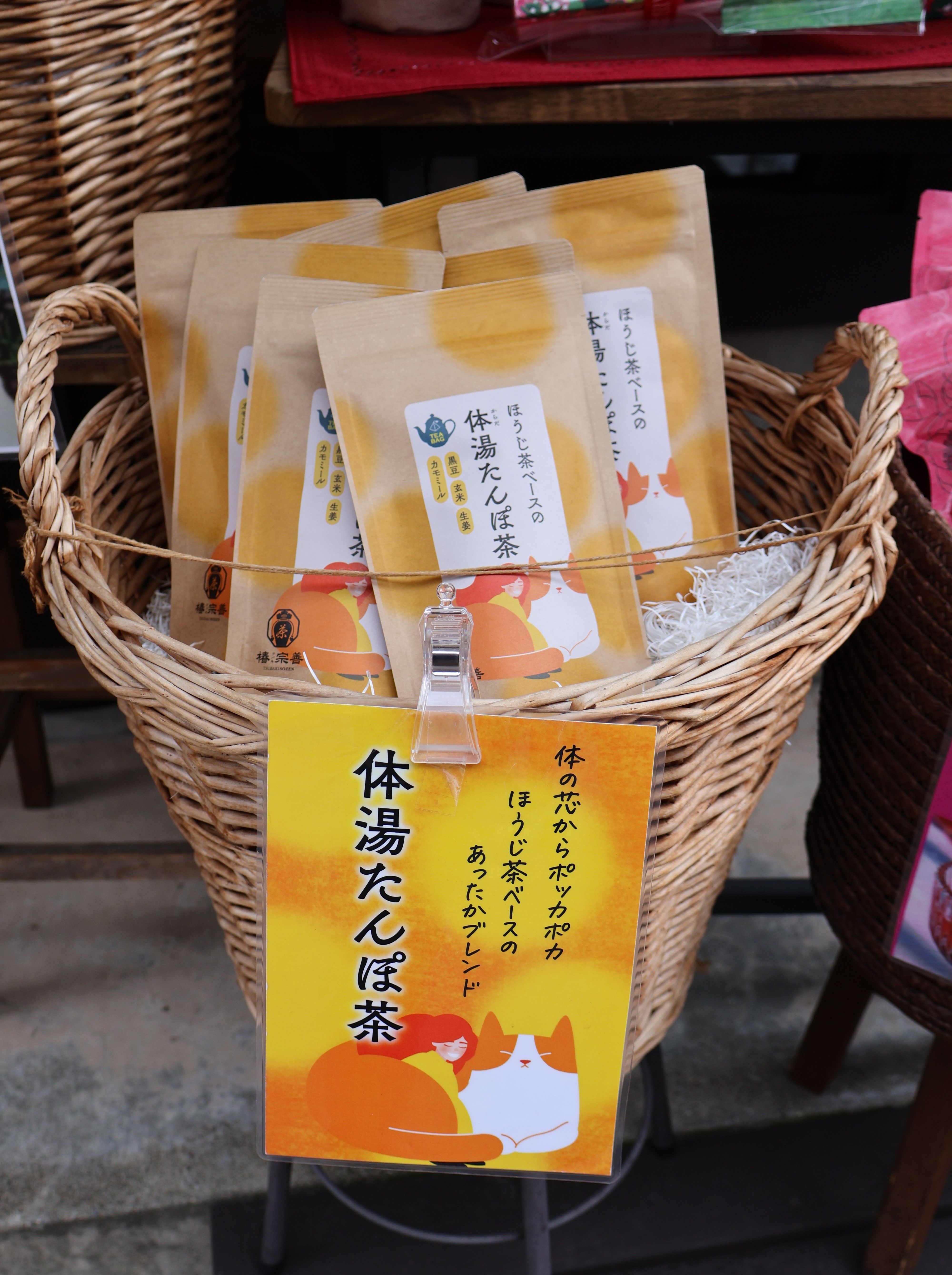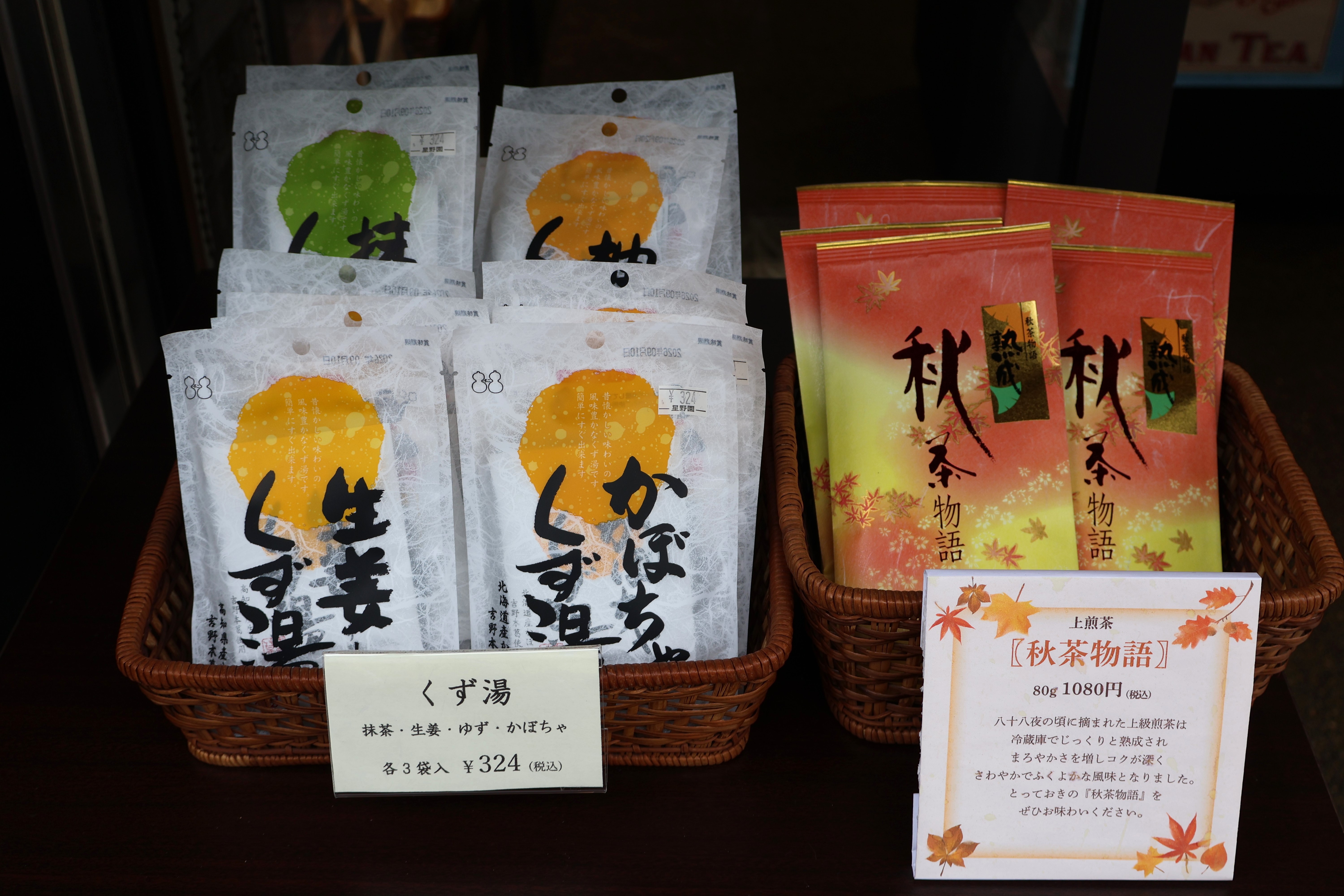 山門からほど近い星野園の店頭には、さわやかでふくよかな風味の秋茶物語と並んでくず湯。