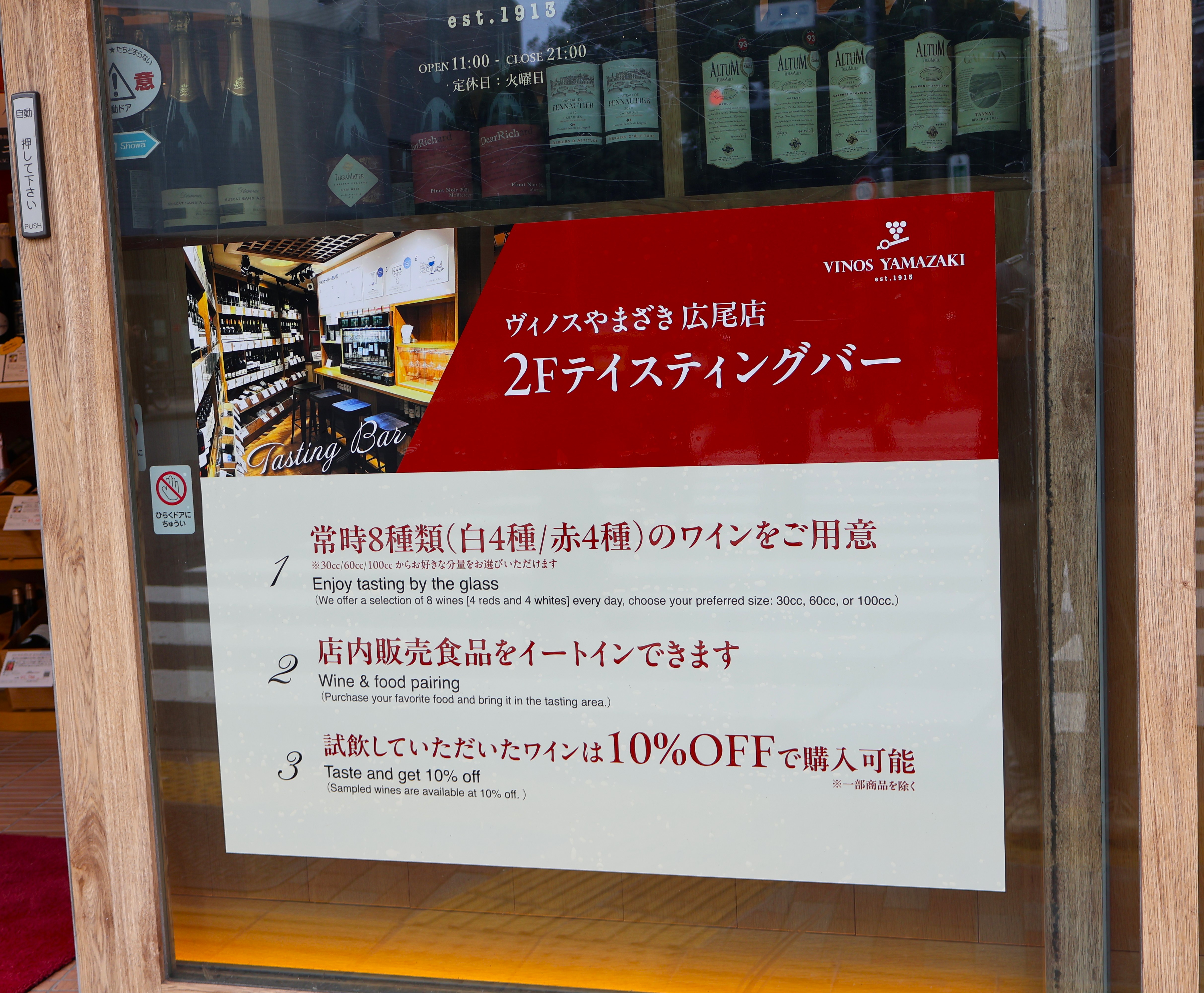 広尾駅2番出口を出てすぐのヴィノスやまざき広尾店の2階テイスティングバーでは、ワイン好きにはたまらない素敵な空間でお気に入りワインを見つける試飲が楽しめるのです。
