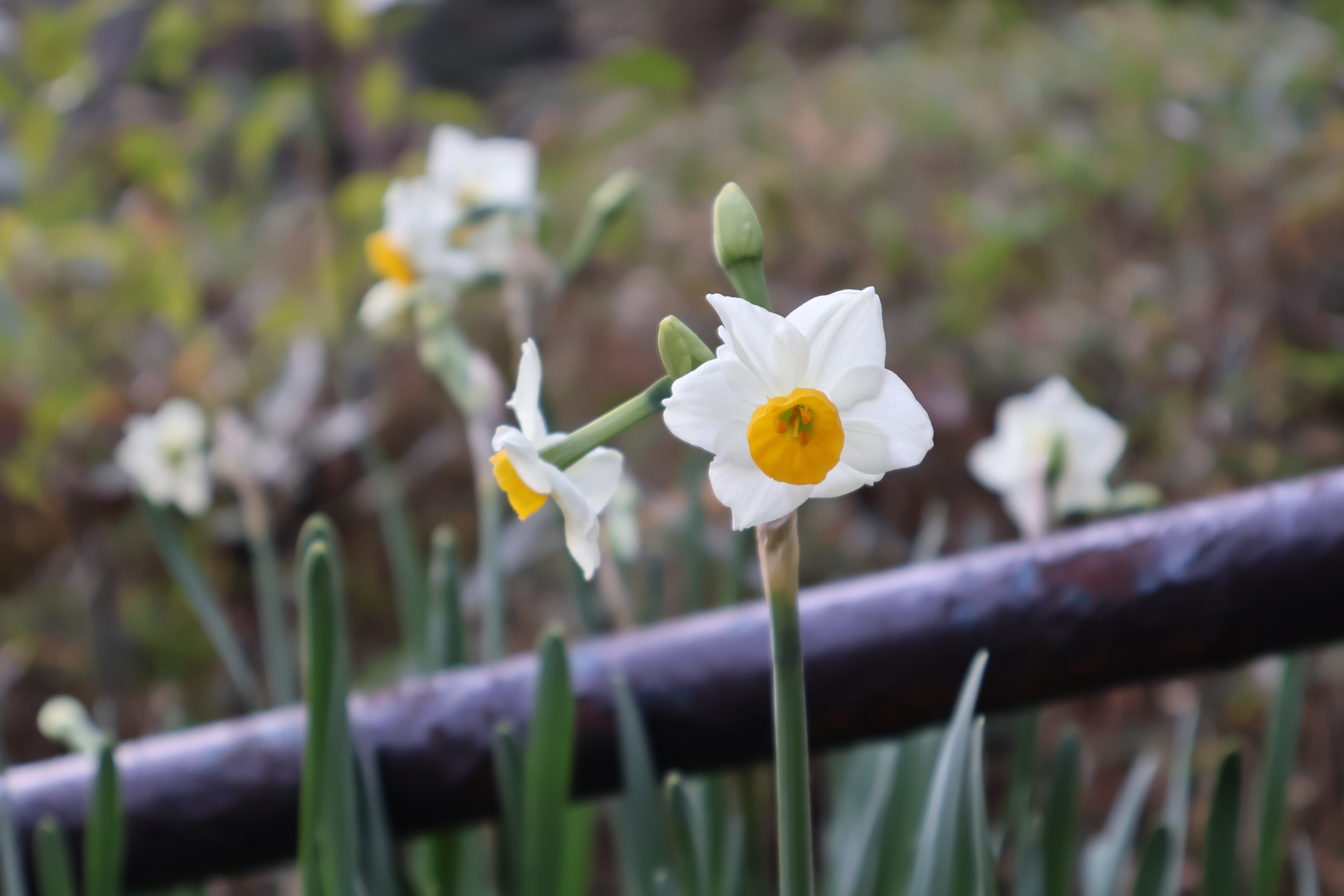 池の畔から上る石段の手すり脇にはスイセン。すっとのびるこの姿を都心で見つけるとなにか得をした気分になります。