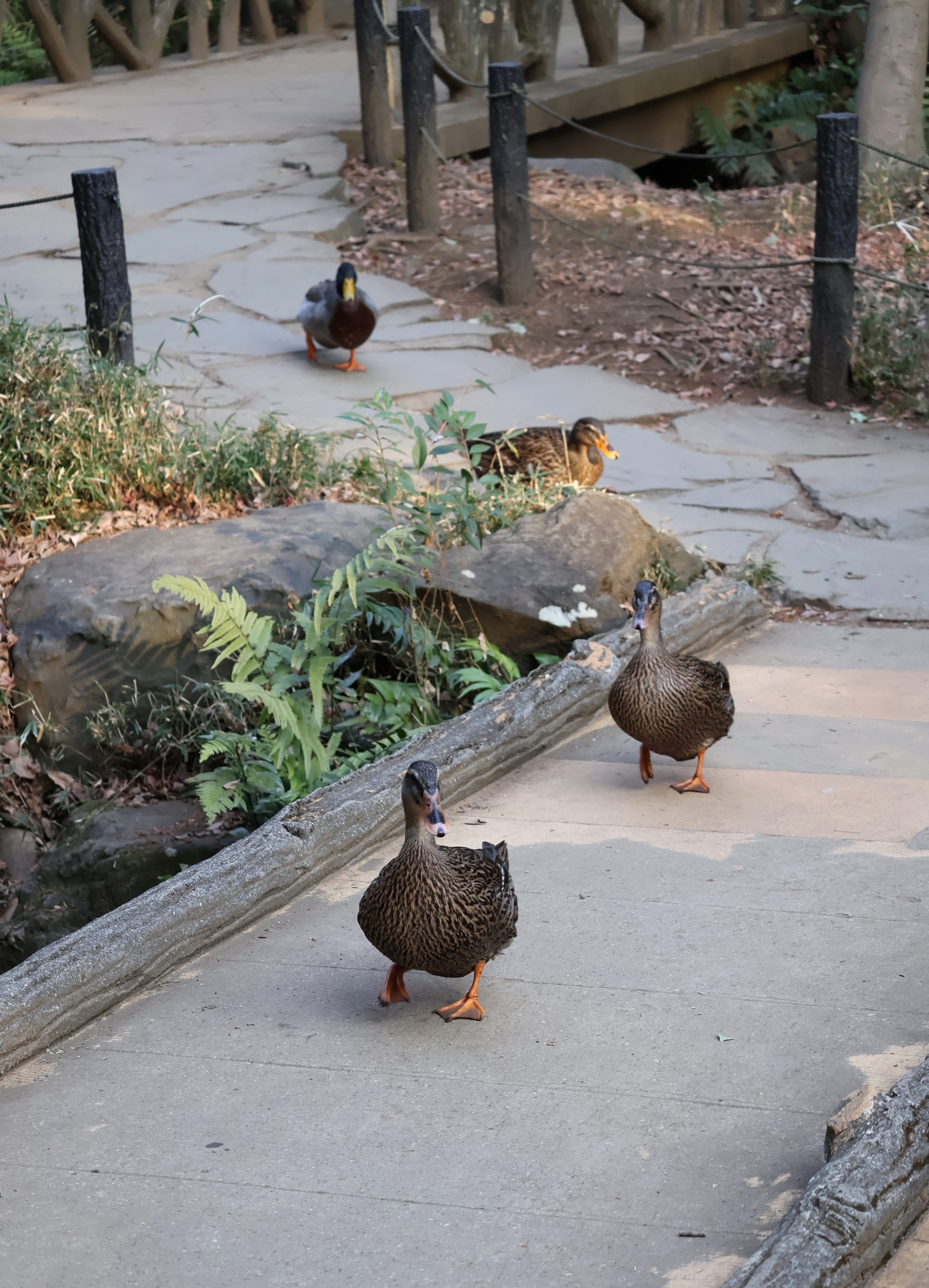 公園の奥、しずかな渓流にかかるカクカク橋(子どもの頃からこう呼んでいます)で写真を撮っていた時、なんと四羽のカモがこちらに向かってペタペタペタと行進してきました。