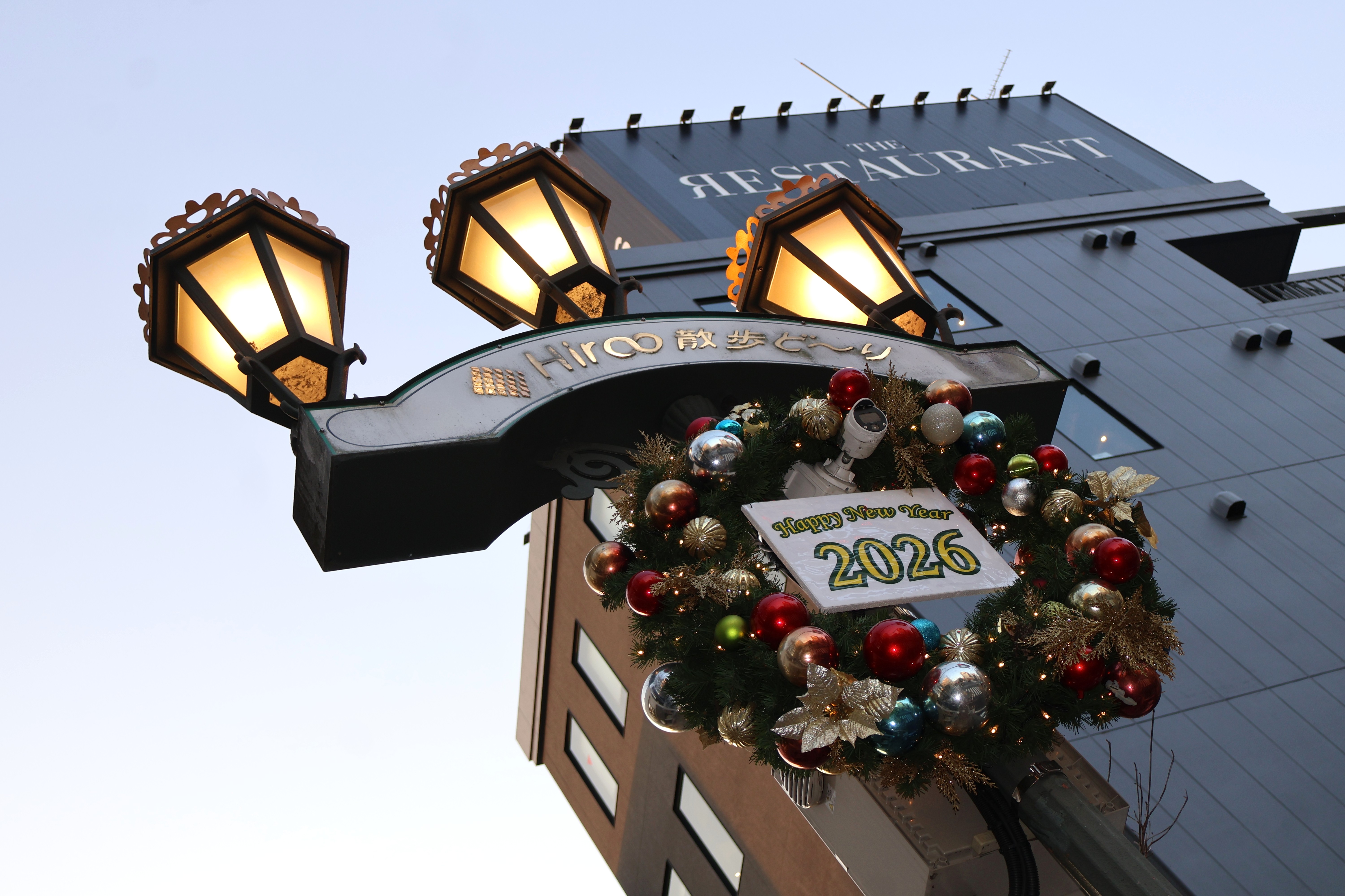 クリスマスから新年にかけて街路灯に掛けられていたリースは1月末で外される予定です。