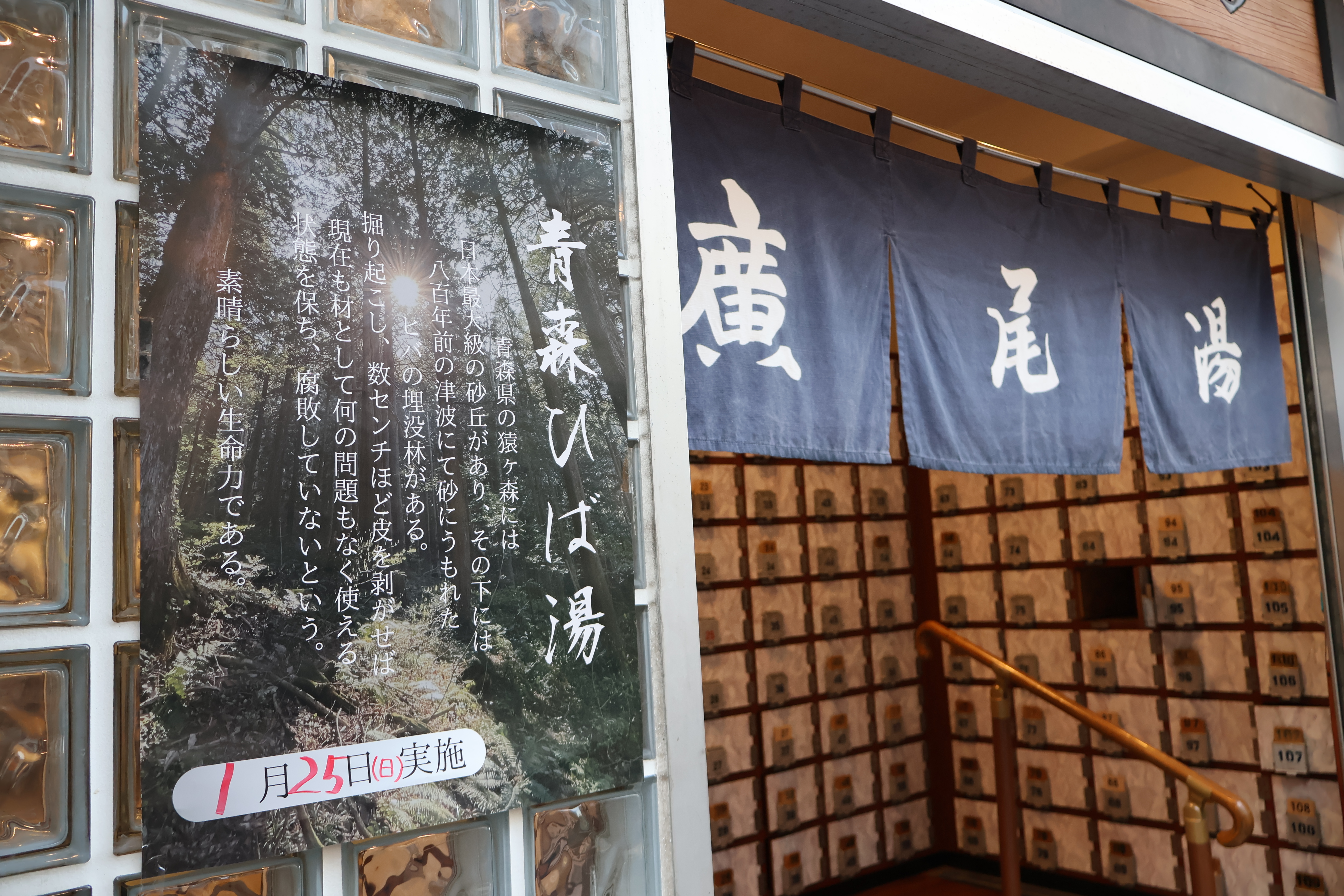 広尾駅前交差点からすぐの広尾湯では1月25日(日)に「青森ひば湯」を楽しめます。