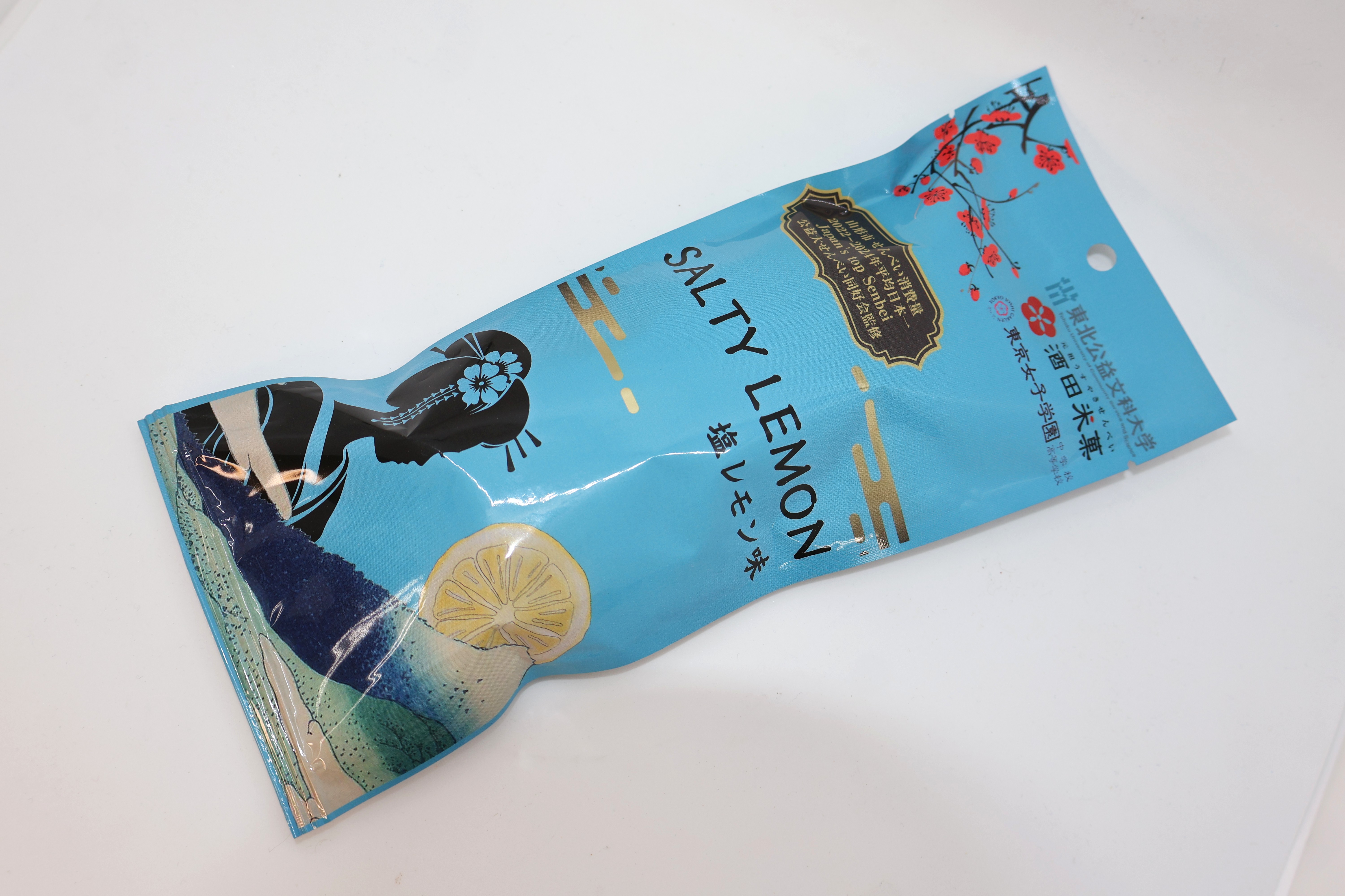 袋の裏面には「酒田米菓・東北公益文科大学・東京女子学園による産学連携企画で生まれた塩レモン味」と書かれています。