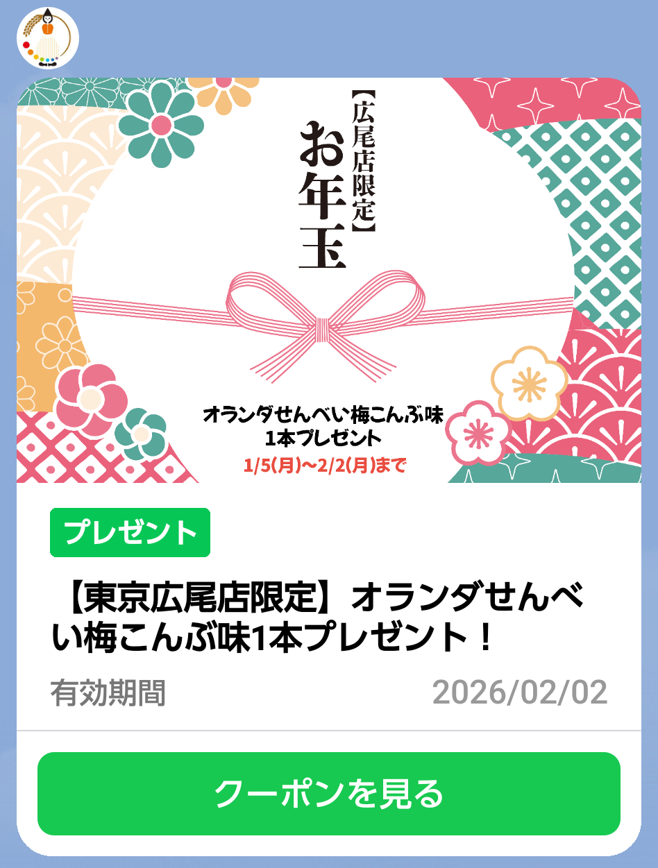 スマホをチェックすると私にもちゃんと来ていましたので、オランダせんべい梅こんぶ味のお年玉、しっかりいただきました。