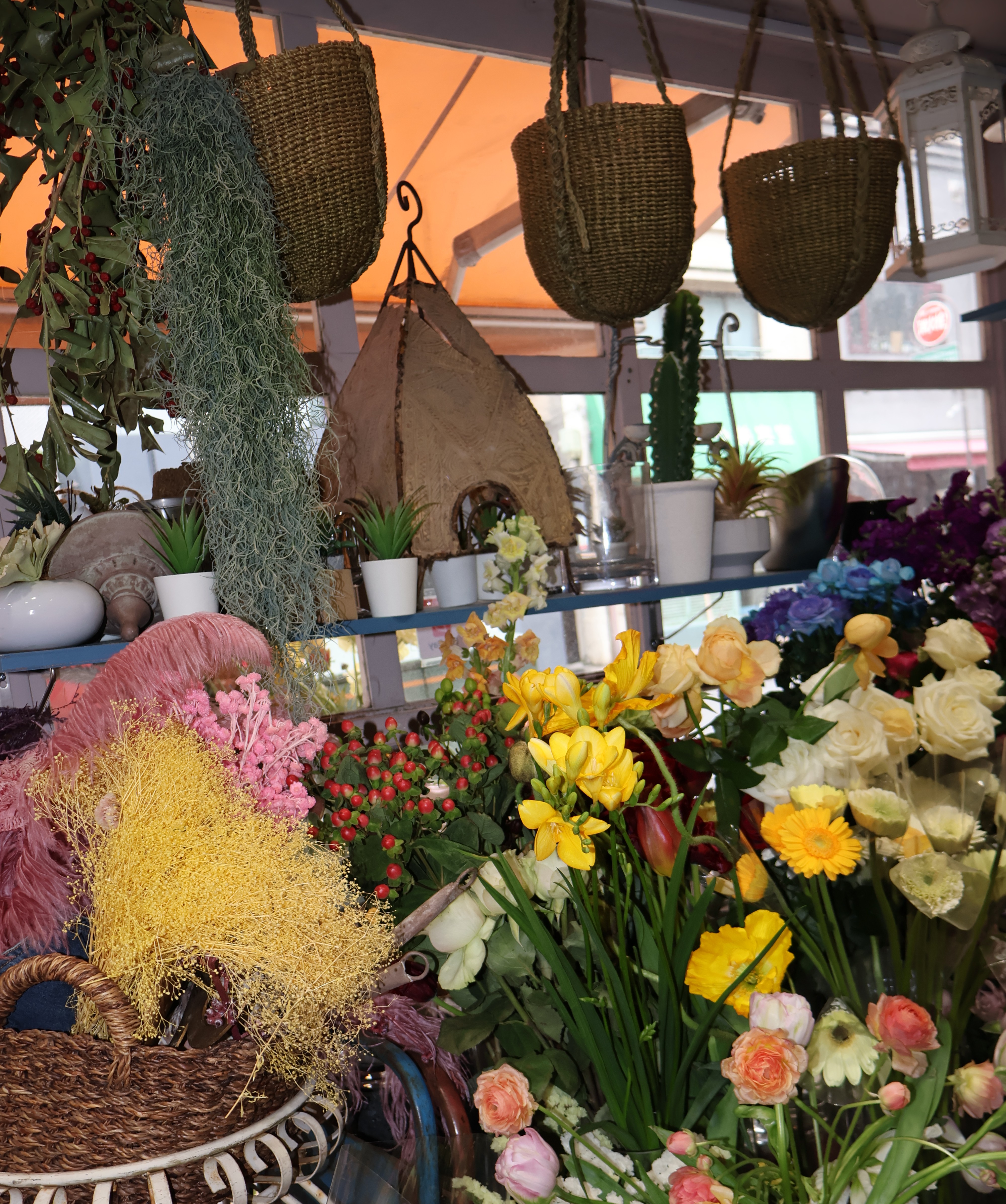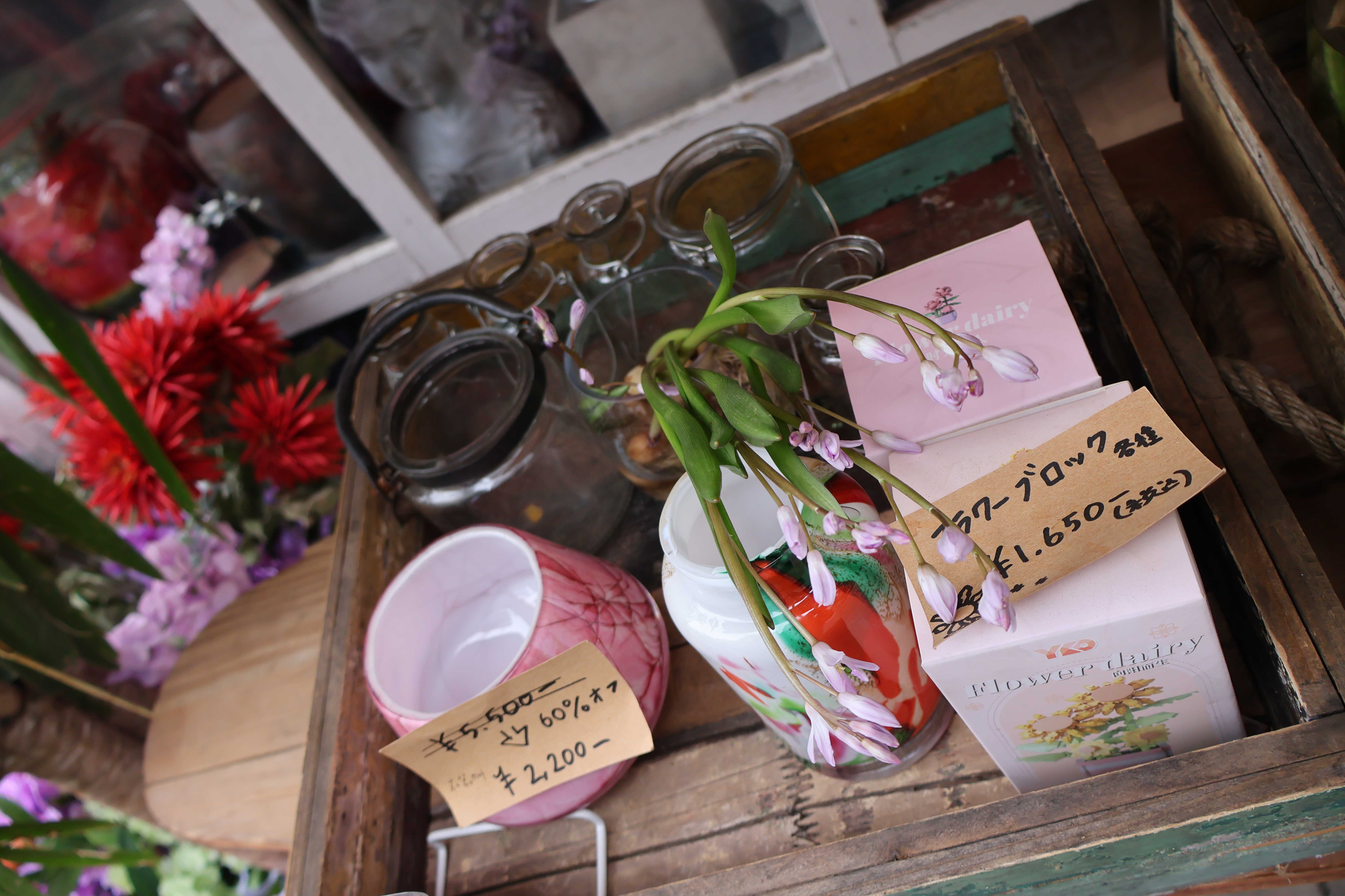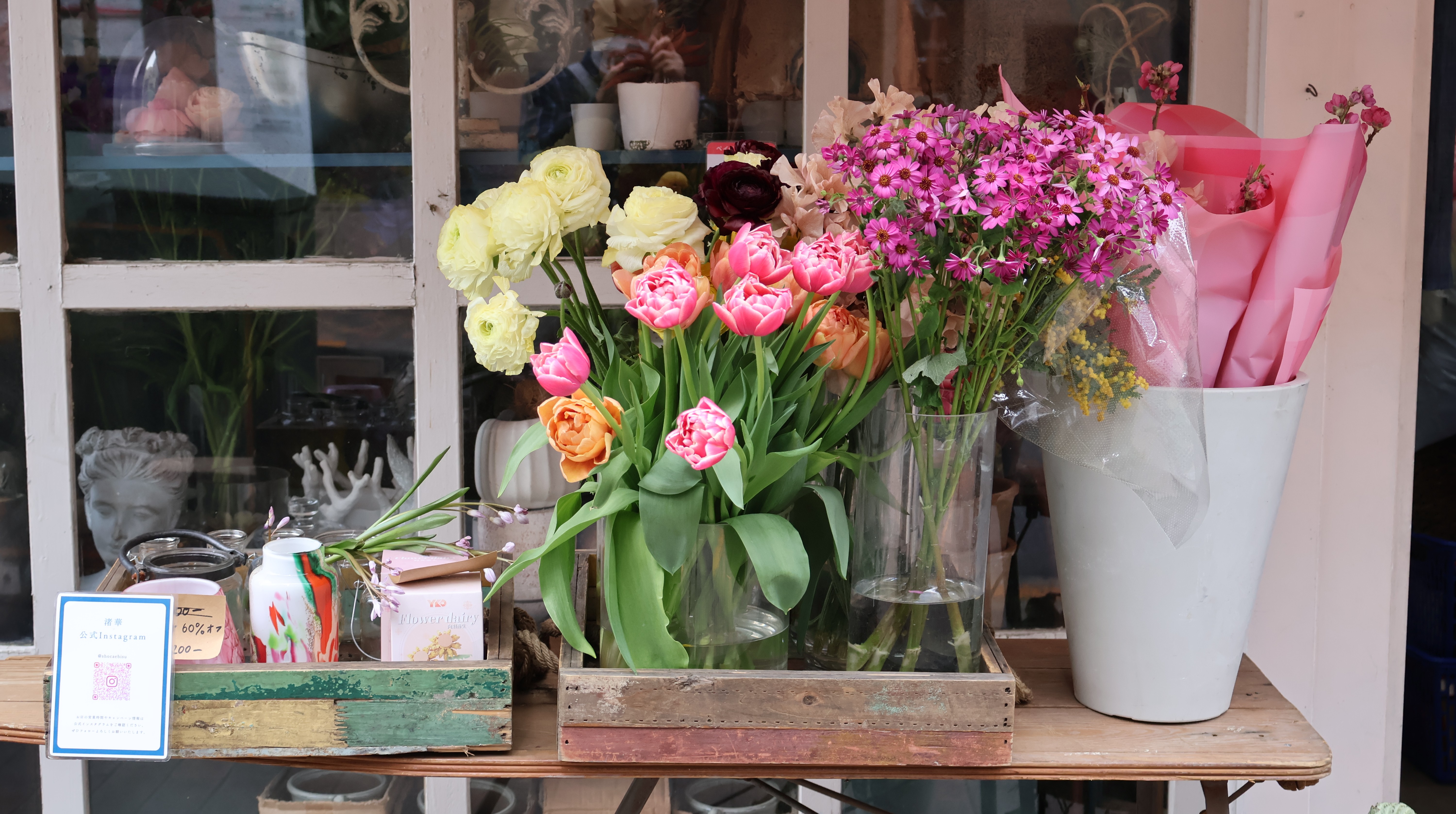 時折店先に並ぶお花や雑貨も変わったものが置かれていることがあり毎回要チェックです。チューリップやピンクの色彩に春を感じます。
