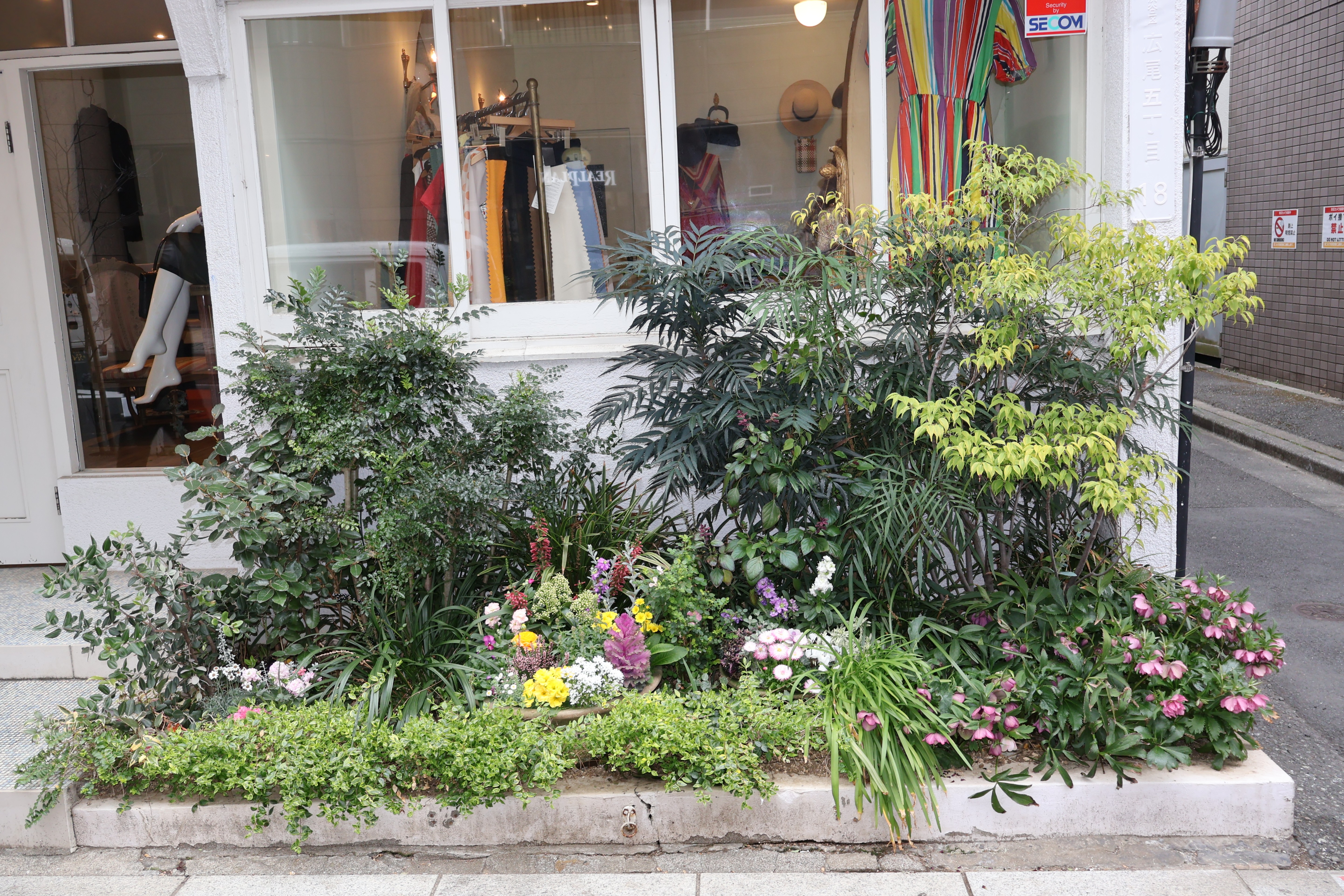 渚華から並び2軒先にあるヴィンテージショップ「Kio」の花壇も、毎月2回のお手入れが入り、丁寧な植栽で季節の彩を楽しませてくれます。