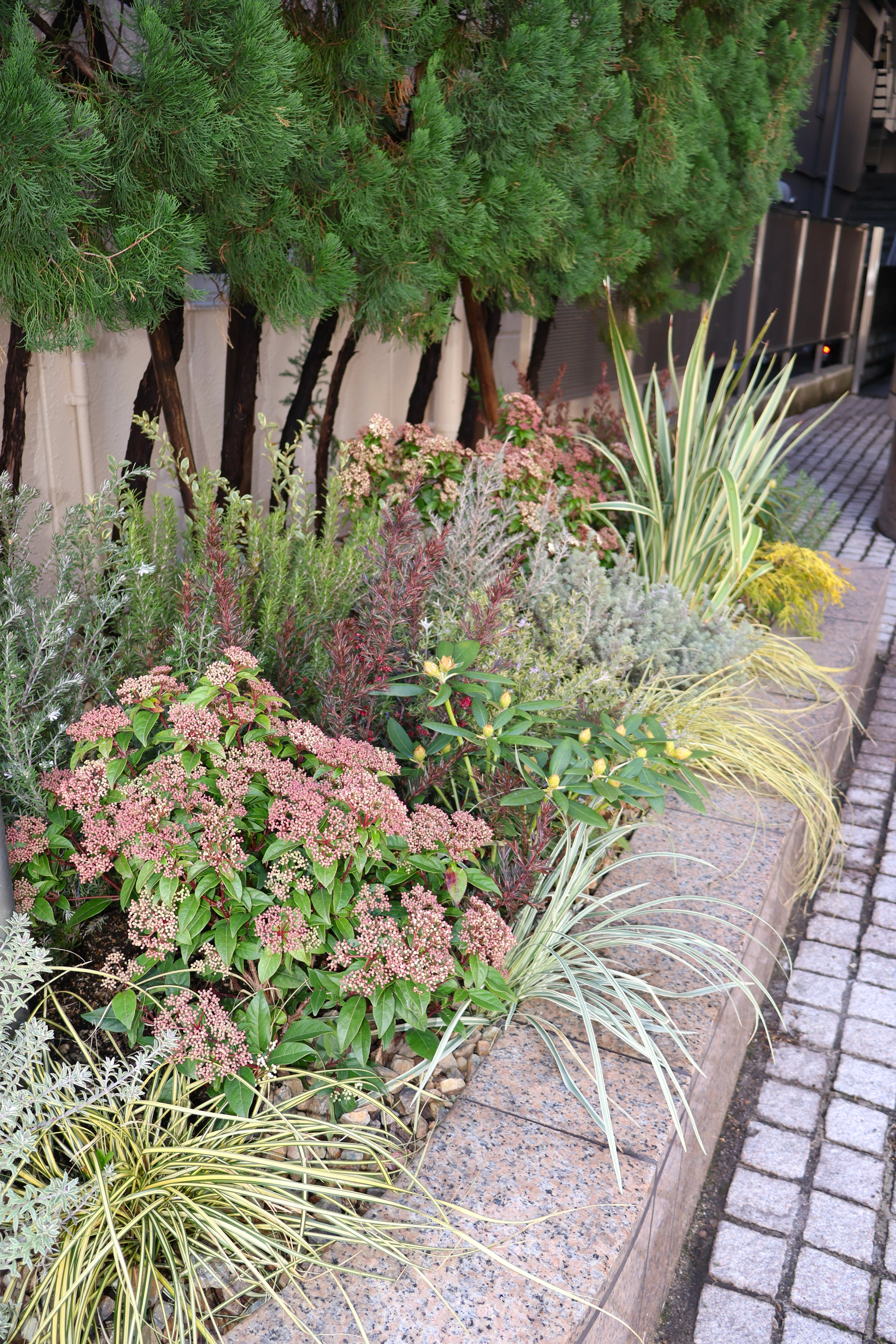 毎週多くのライブ等が行われて大勢の方が訪れるホール「La Salle F」を持つFIビルの入口が素敵にリニューアルされ、化粧砂利が敷かれた花壇にも多彩な植物が植えられています。