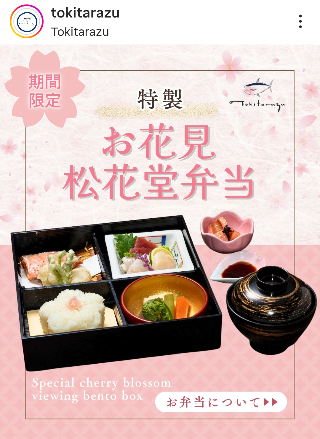 Located along Meiji Street, one of Tokyo’s popular cherry blossom spots, Tokitarazu 🐟 offers a unique dining experience where you can enjoy your meal while admiring the beautiful sakura.