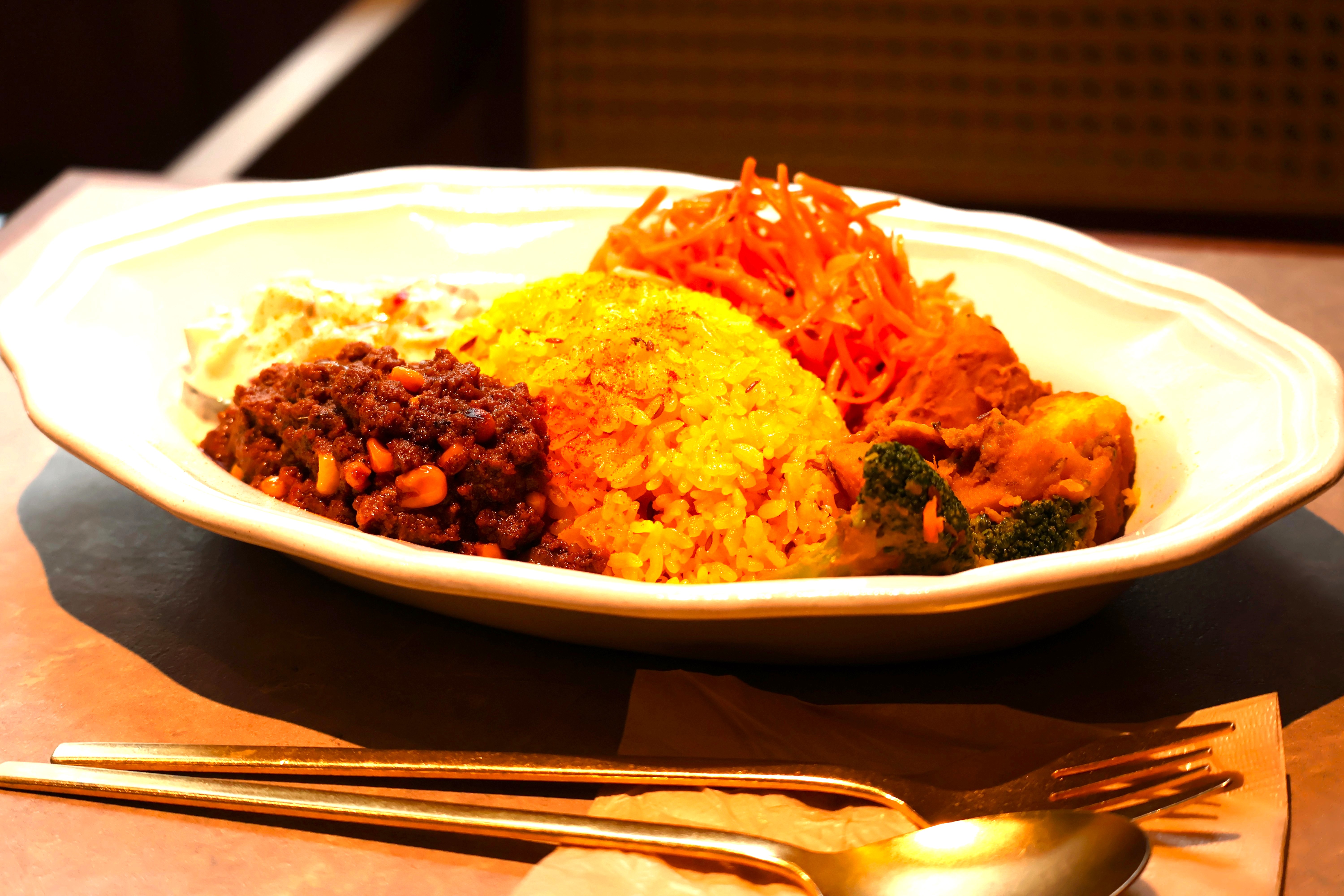 中目黒にあるForresterさんに作っていただくカレーを使っているそうで、スパイスライスはカルダモン、クローブ、ローリエで香りづけしたスパイスオイルとターメリック&クミンシードを一緒に炊いていると、詳しく教えてくださいました。