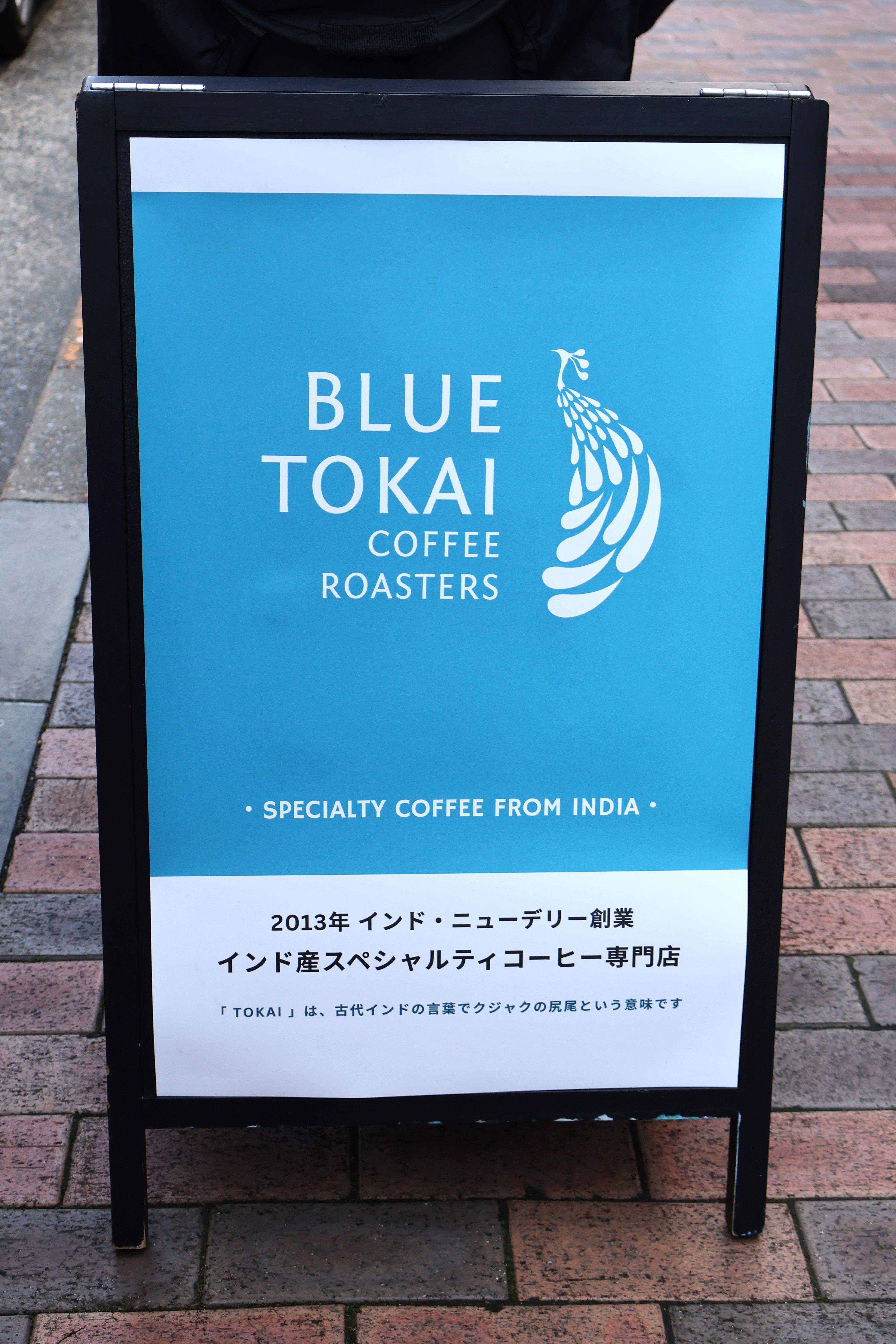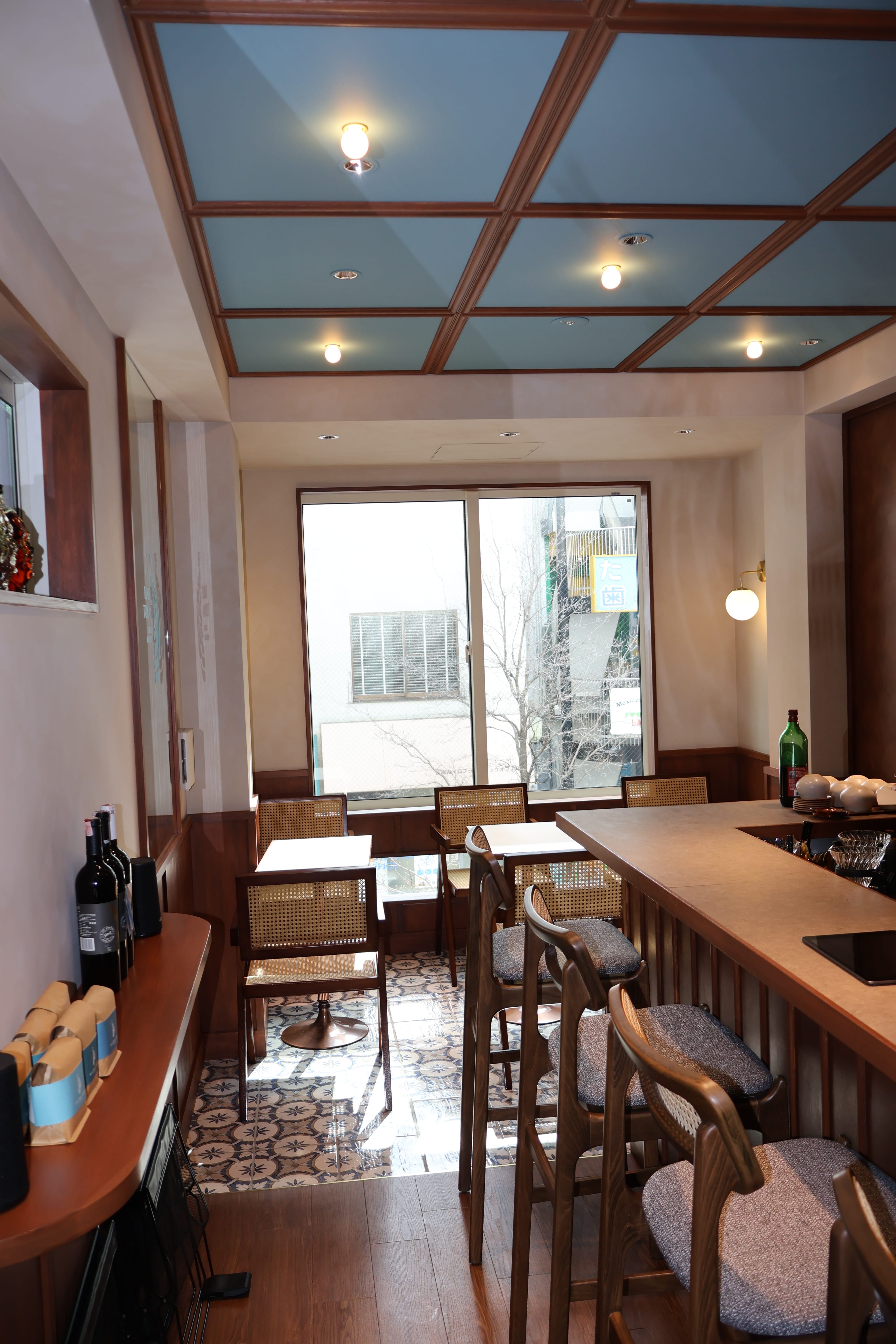 お店のシンボルマークであるBlue Tokai(Tokaiとは孔雀の尻尾という意味)の鮮やかな青が天井にも用いられ、テーブルスペース床に敷かれたシートの柄も相まって、他のカフェには無い特別感を感じるのです。