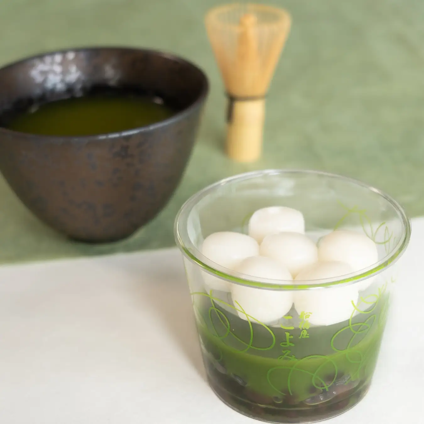 濃厚な抹茶寒天に、職人が丁寧に炊き上げたなめらかな餡子と、もちもちとした白玉を添えました。