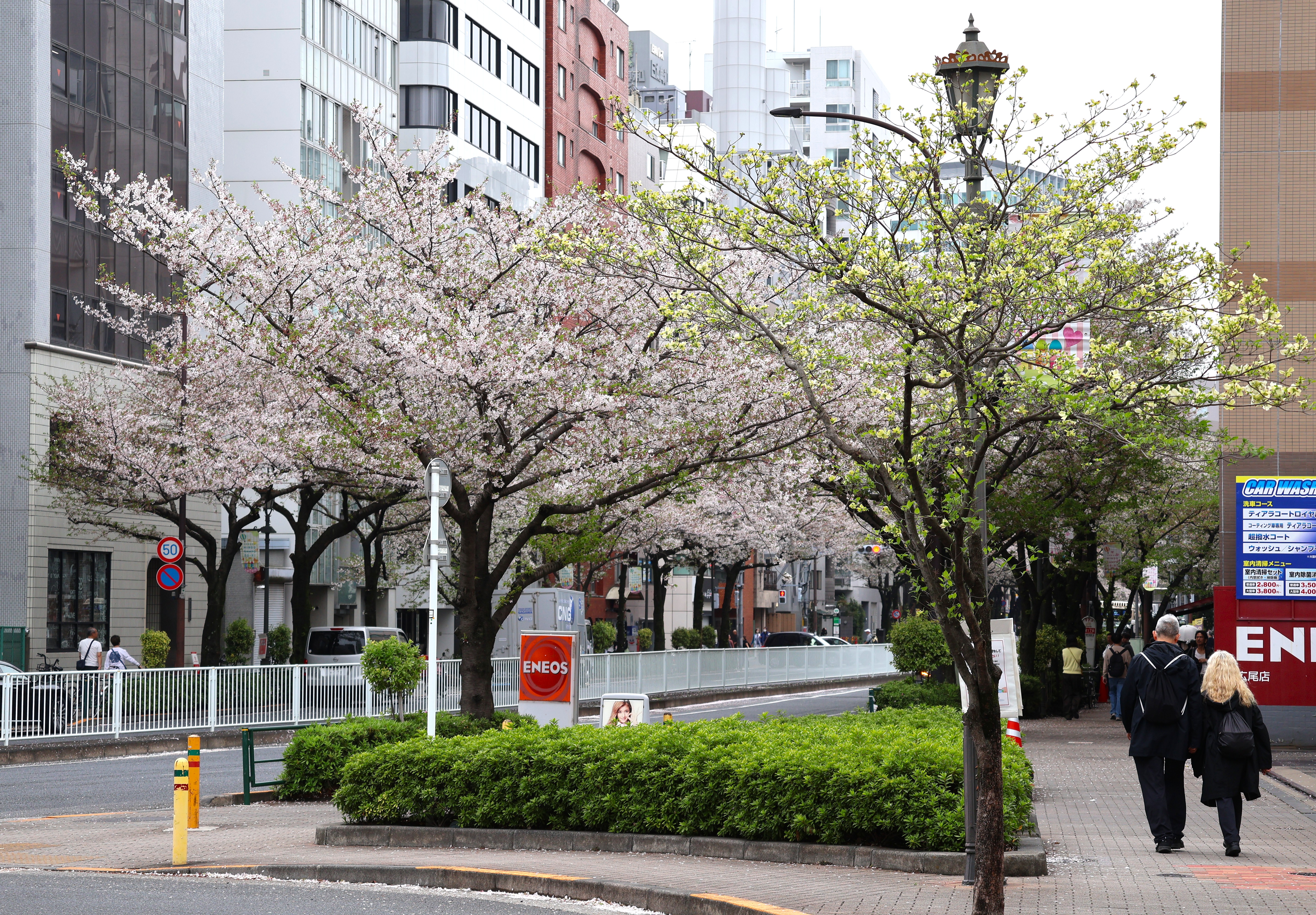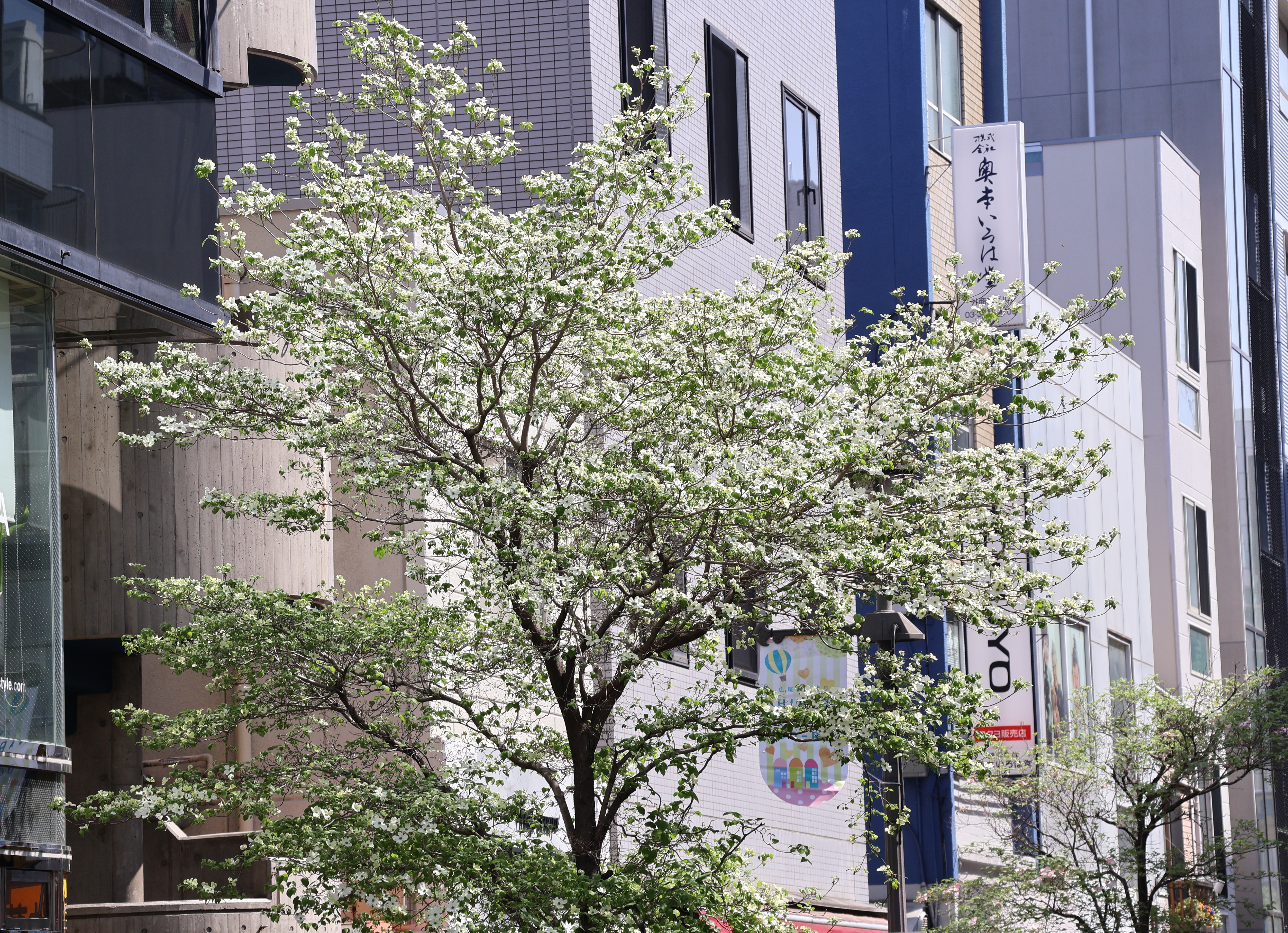 サクラが満開の明治通りを背景に広尾散歩通り中程を彩るハナミズキの見頃が近づいています。