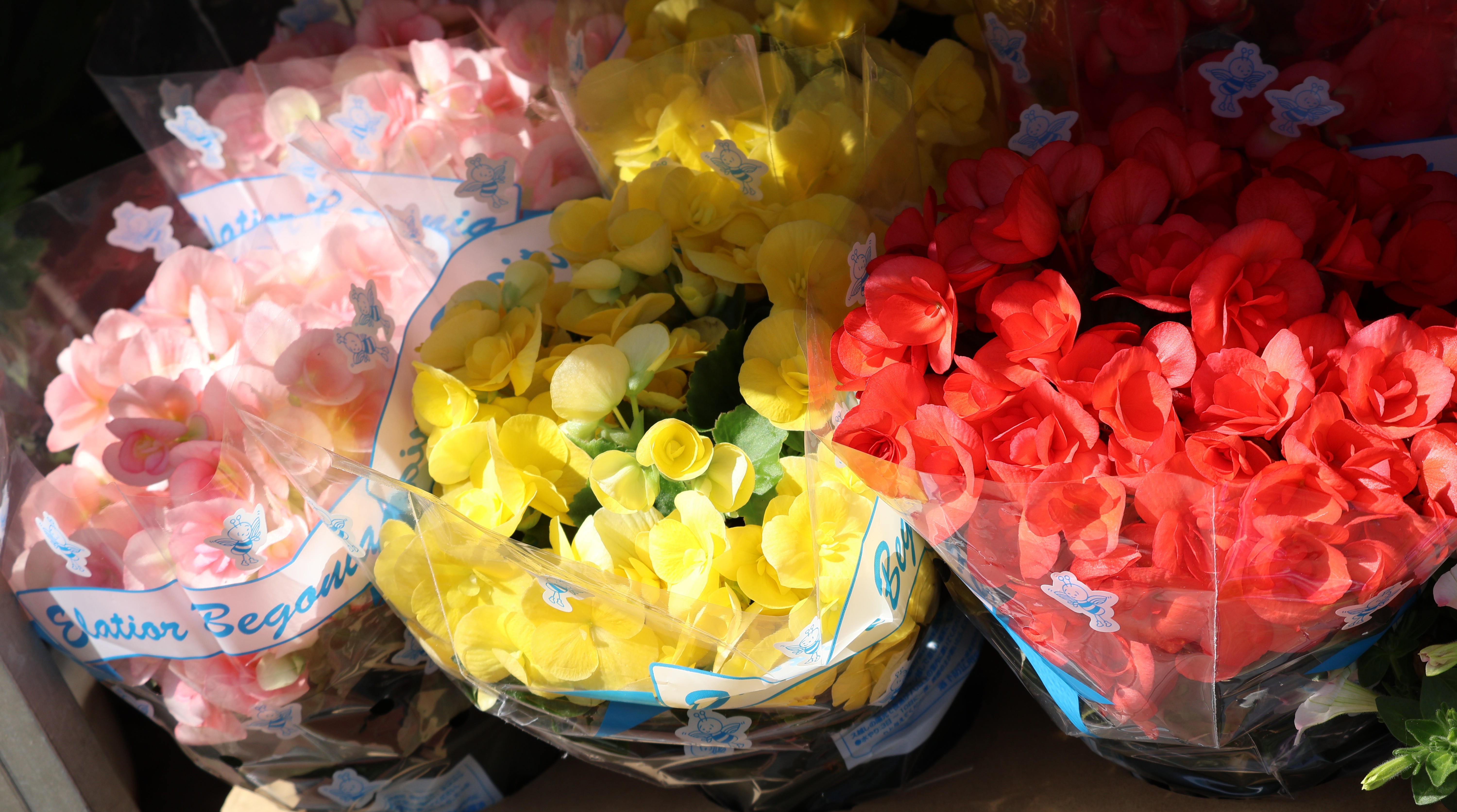 色とりどりの鉢花が並ぶ花寅商店店頭で目を引いたリーガースベゴニア 可憐です